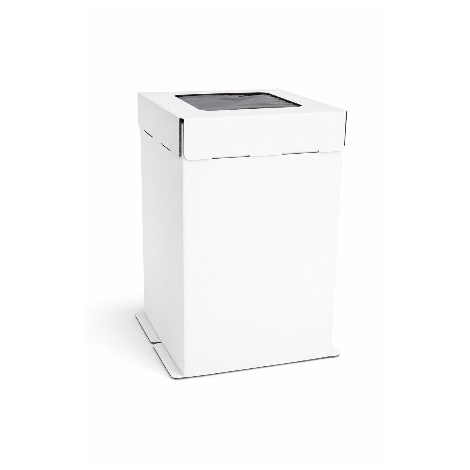 Коробка — 1 окно 300*300*450 мм — высокая коробка из белого микрогофрокартона с одним большим прозрачным окном для демонстрации торта. Формат 30×30×45 см подходит для высоких и многоярусных тортов диаметром до 30 см и высотой до 45 см, обеспечивая защиту при перевозке и хороший обзор декора с одной стороны.
