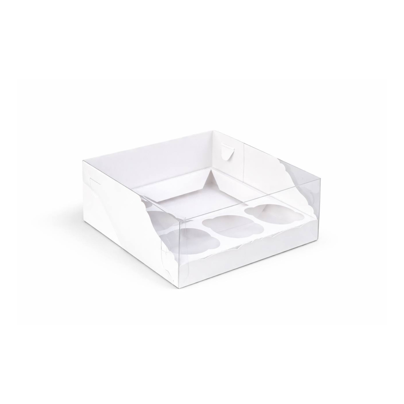 Коробка для капкейков и «бенто» с пластиковой крышкой, 235*235*100 мм — универсальная коробка дно + прозрачная пластиковая крышка, в которую помещается либо бенто-торт, либо до 9 капкейков с ложементом. Формат 23,5×23,5×10 см хорошо подходит для подарочных наборов «мини-торт + капкейки» или для одного среднего десерта с высоким декором, сохраняя жёсткость и наглядную подачу.