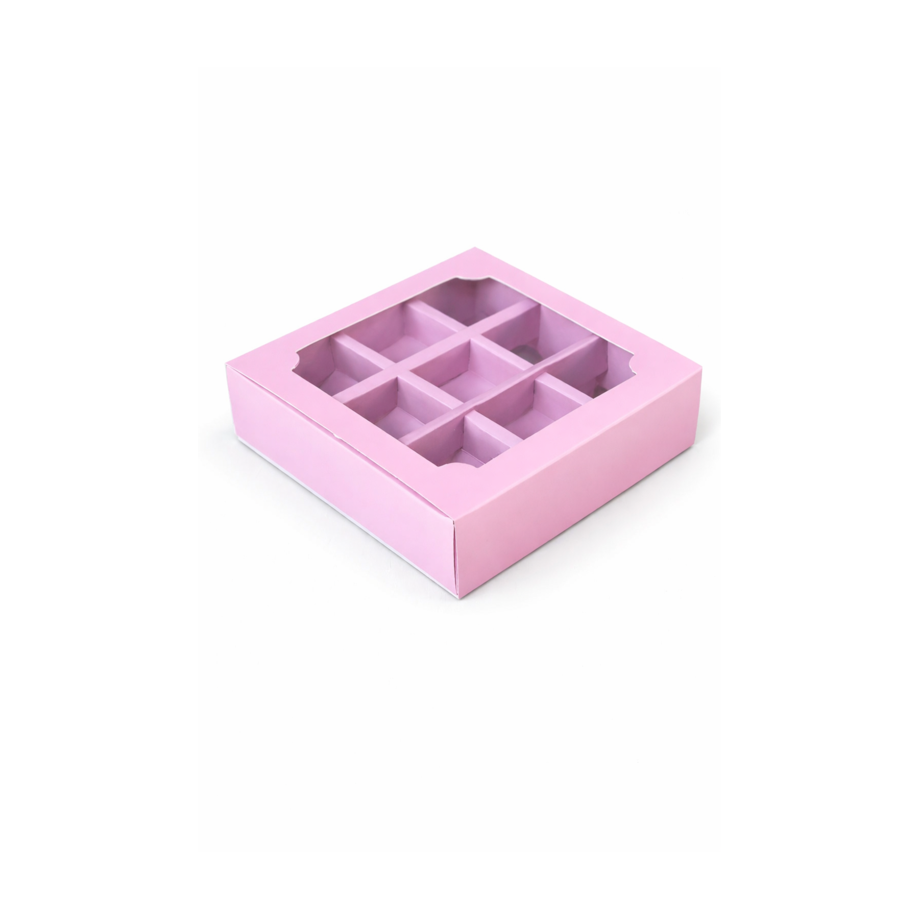 Коробка под 9 конфет пыльно-розовая с окном и крышкой-пеналом 135*135*35 мм
