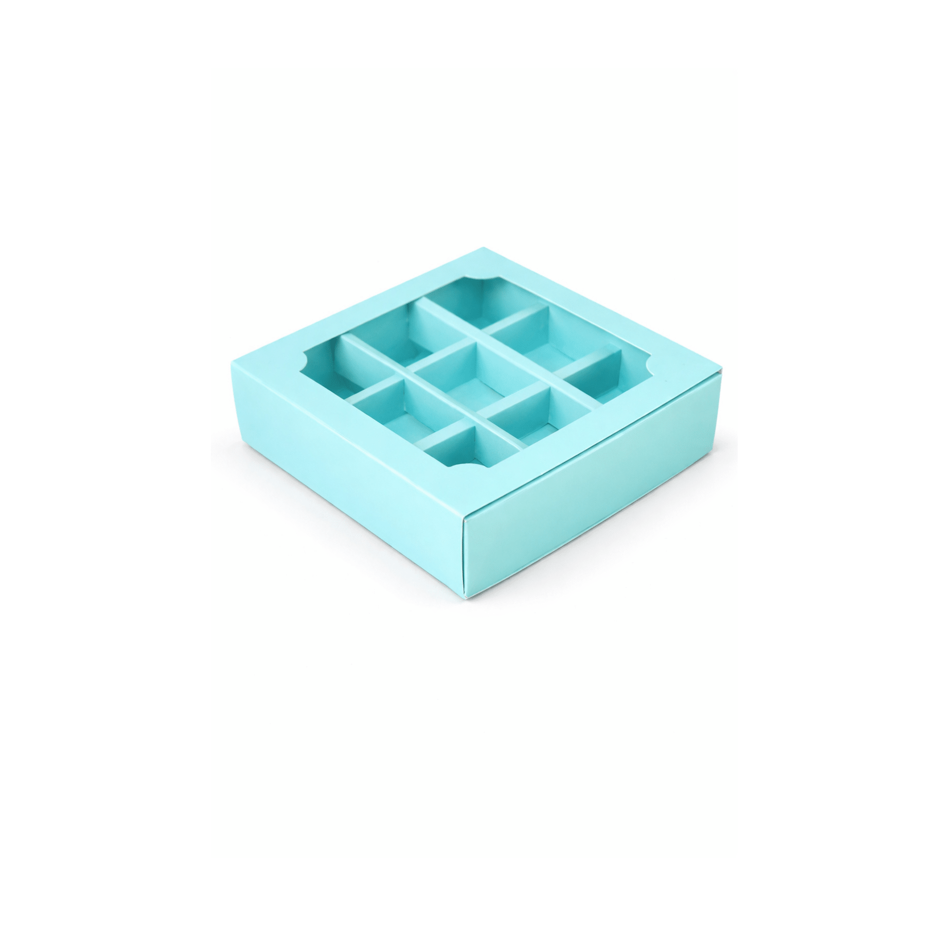 Коробка под 9 конфет мятная с окном и крышкой-пеналом 135*135*35 мм