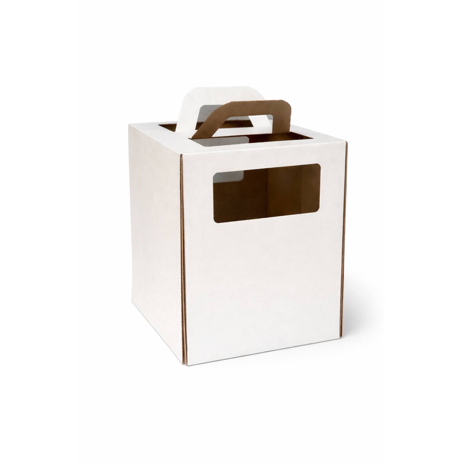 Коробка с ручкой и окном 240*240*260 мм — крупная высокая коробка из белого гофрокартона с прозрачным окном для очень больших и многоярусных тортов до 42 см в диаметре и примерно 40–45 см по высоте. Конструкция обычно трёхсоставная (усиленное дно + высокая боковая «рубашка» + крышка с окном), рассчитана на вес торта до 8–10 кг и удобна для безопасной транспортировки и эффектной витринной подачи.