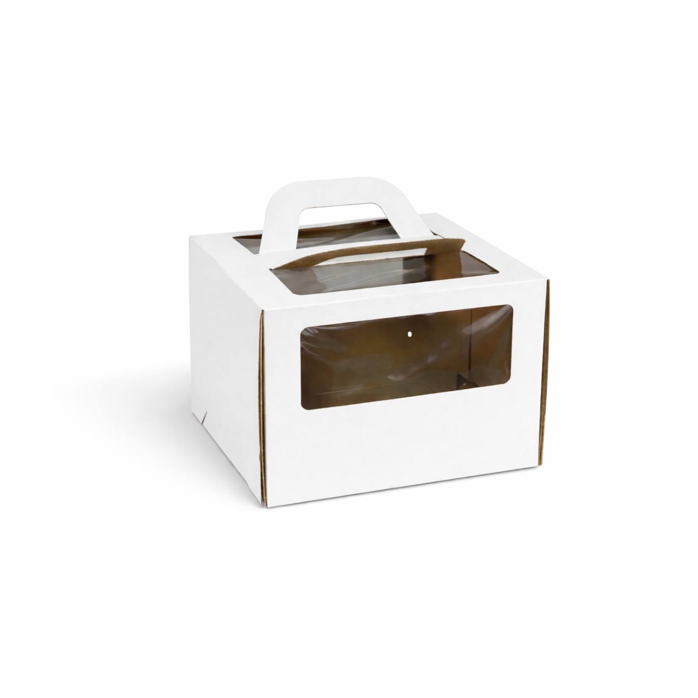 Коробка с ручкой и окном 260*260*200 мм — квадратная коробка из белого микрогофрокартона для тортов и пирогов высотой до 20 см. Прозрачное окно в крышке и вырубные ручки делают её удобной для переноски праздничных тортов на 8–12 порций, а цельная самосборная конструкция собирается без клея