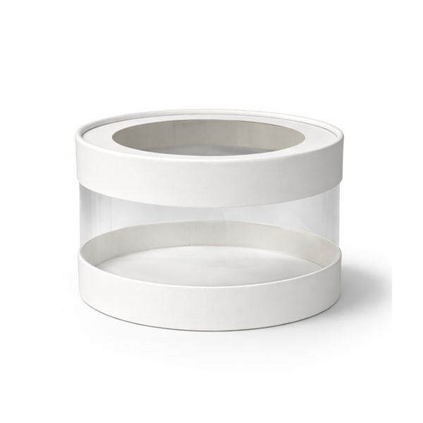 Белая круглая шляпная коробка с окном и прозрачными стенками — стильная и практичная подарочная упаковка, подчёркивающая ценность содержимого.