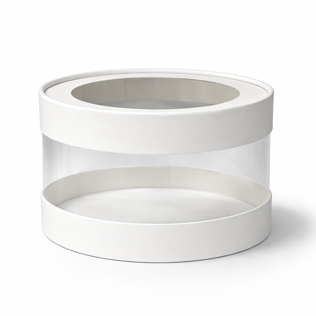 Белая круглая шляпная коробка с окном и прозрачными стенками — стильная и практичная подарочная упаковка, подчёркивающая ценность содержимого.